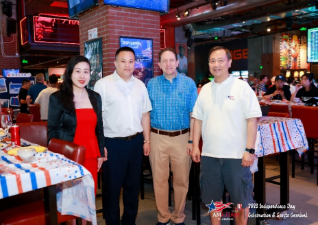 ▲On July 2, 2023, Mr. Dong Maojin (second from left) attended the American Independence Day event and posed for a photo with James Heller, the U.S. Consul General in Shanghai (second from right), and Eric Zheng, President of the American Chamber of Commerce in Shanghai (first from right).